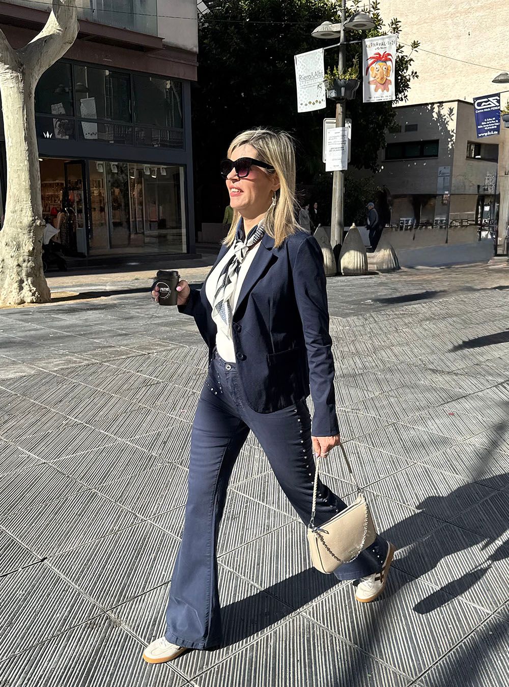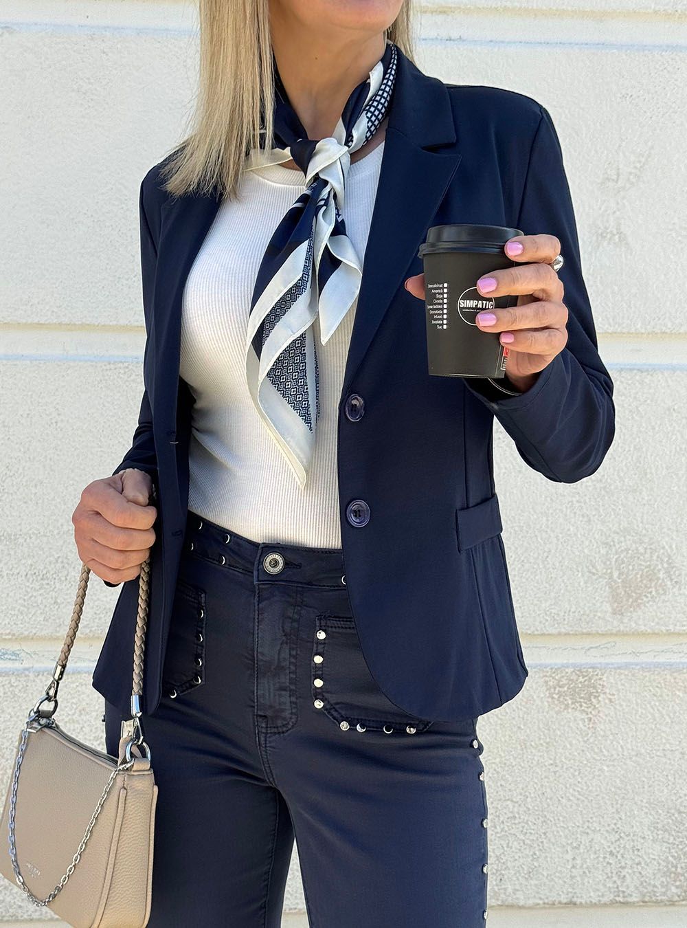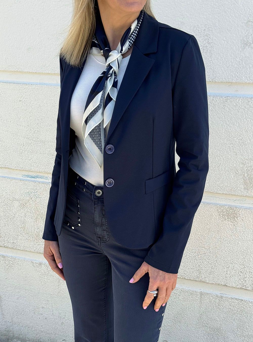 Americana clásica entallada, confeccionada en tejido de algodón elástico. Dos bolsillos laterales. Cuello y solapa estilo sastre. Cierre frontal con dos botones anacarados.