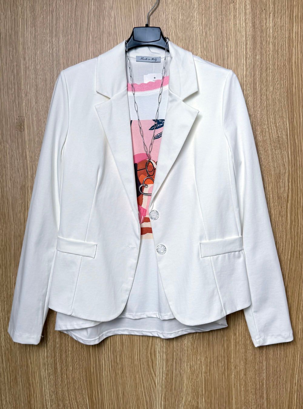 Americana clásica entallada, confeccionada en tejido de algodón elástico. Dos bolsillos laterales. Cuello y solapa estilo sastre. Cierre frontal con dos botones anacarados.