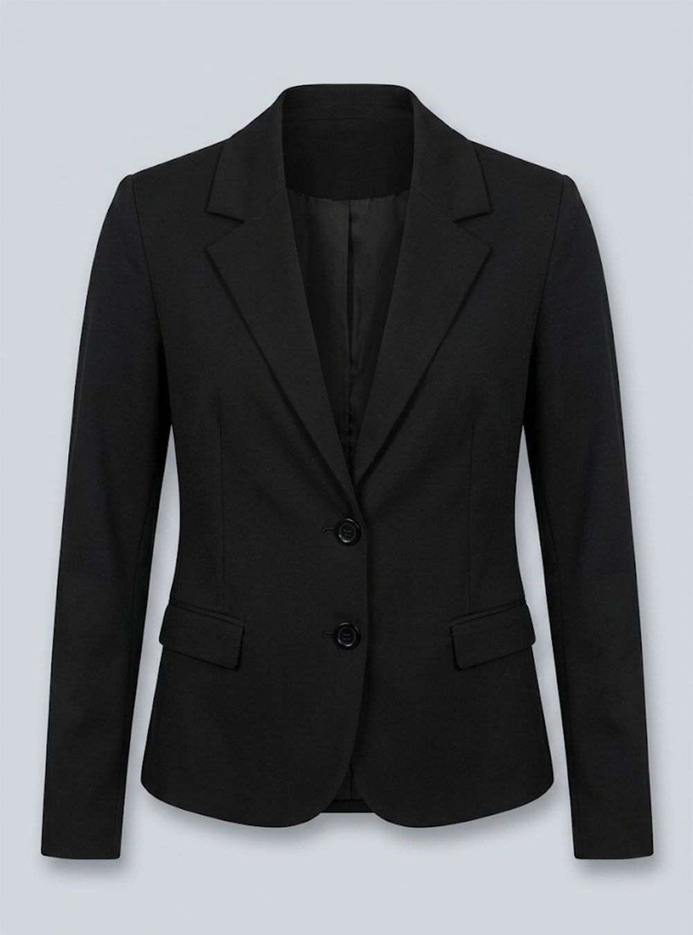 Americana clásica entallada, confeccionada en tejido de algodón elástico. Dos bolsillos laterales. Cuello y solapa estilo sastre. Cierre frontal con dos botones anacarados.