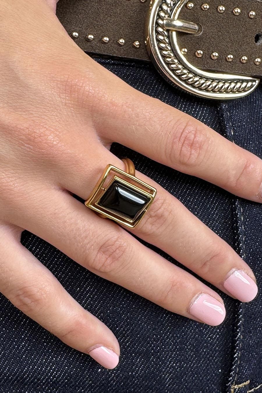 Anillo con estructura rectangular dorada y piedra giratoria en color negro.