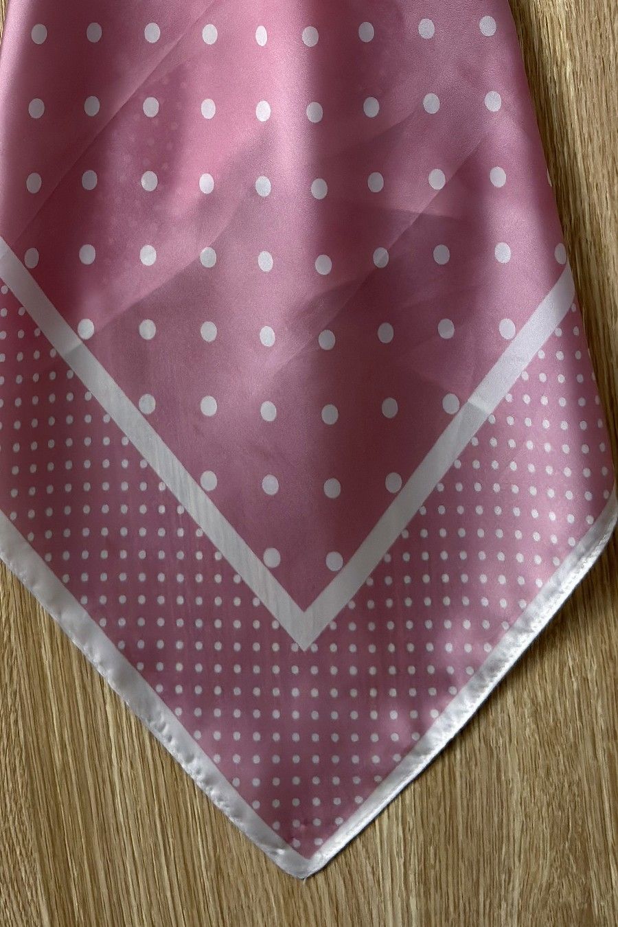 Bandana de raso satinado estampada con lunares de dos medidas. Forma cuadrada. El accesorio ideal multi posición, ideal para llevar al curllo estilo corbata, cow-boy o anudado en el lateral. También perfecto como cinturón o para llevar atado a la cintura.