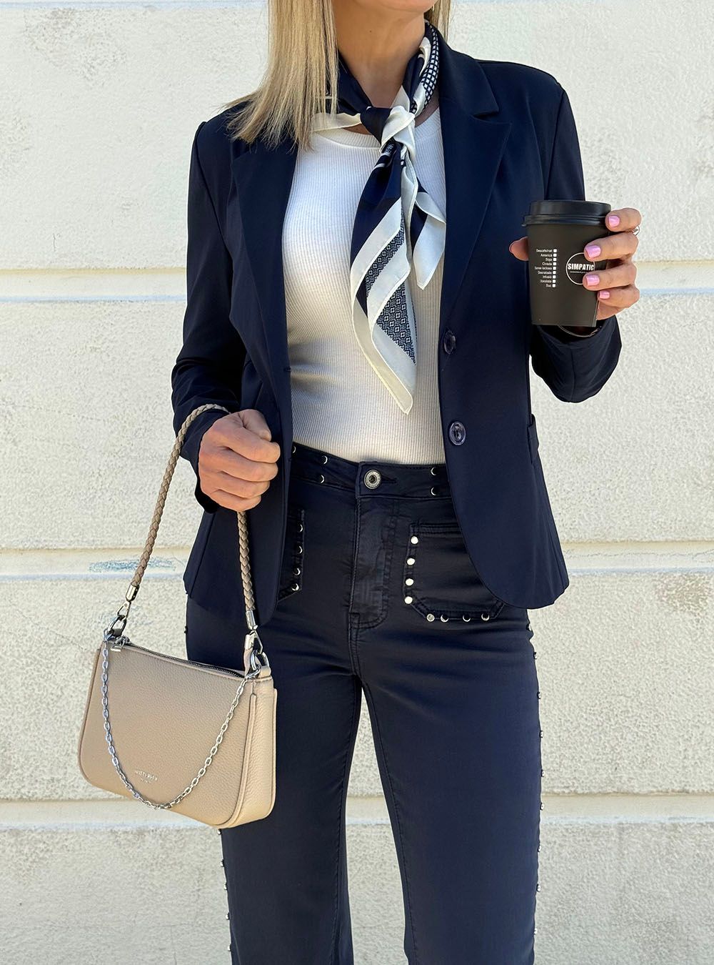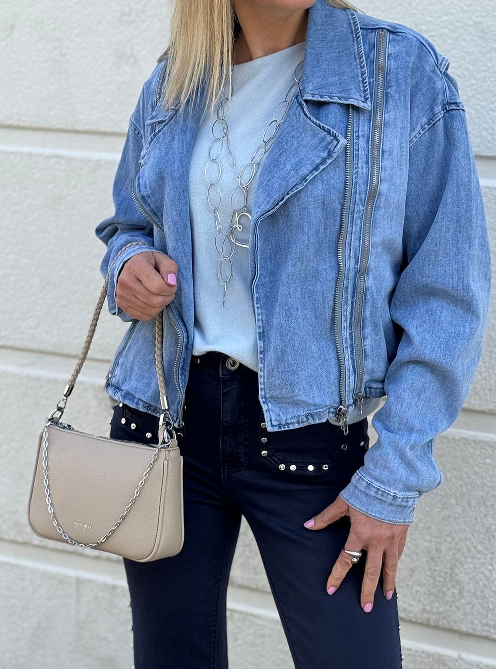 Bandolera confeccionada en polipeil texturada. Dos asas extraíbles: una trenzada del mismo material y otra de cadena metálica. Cierre superior y trasero con cremallera. Un bolso minimalista, sobrio y atemporal perfecto para tus outfits casual y sport chic.