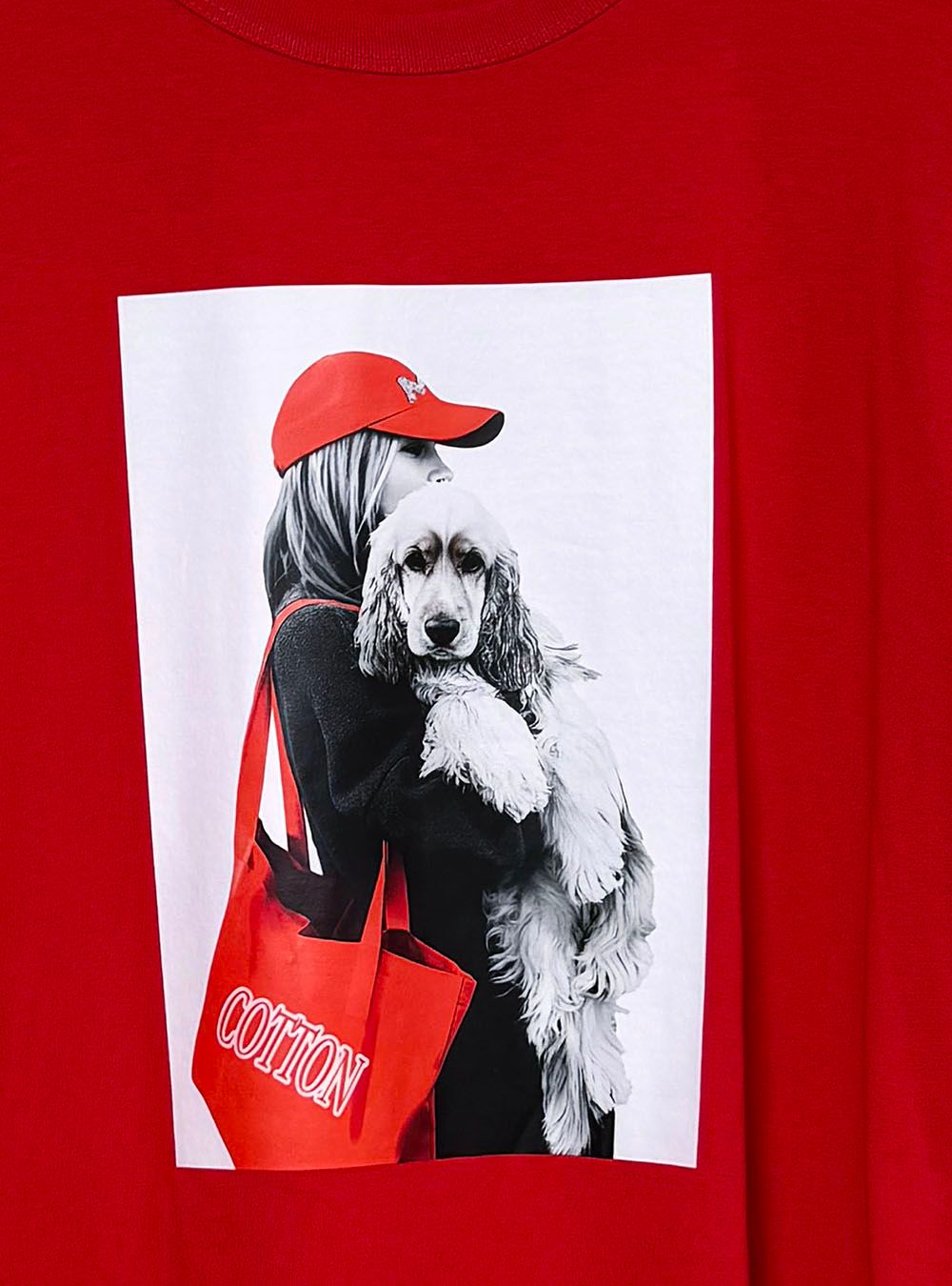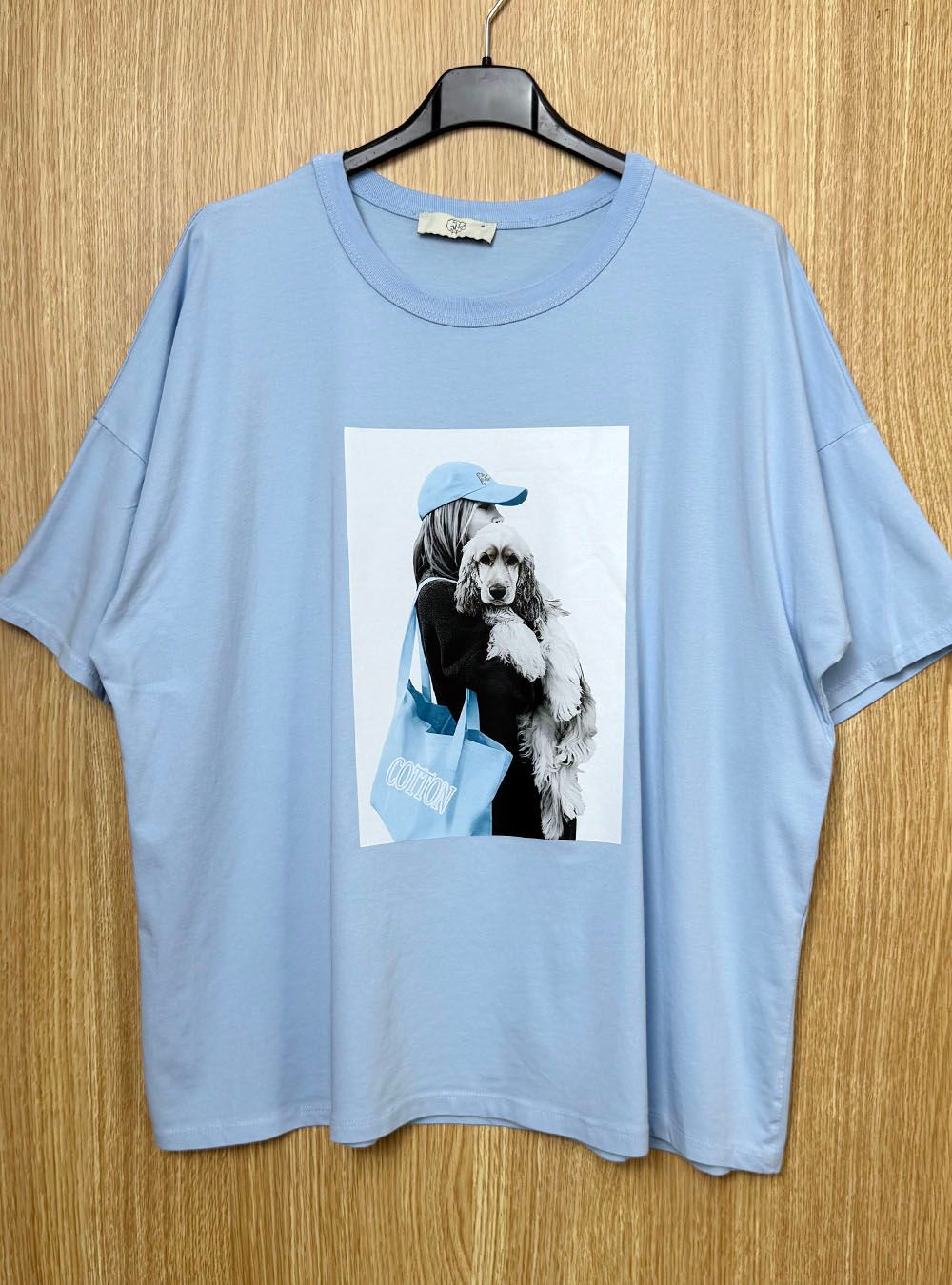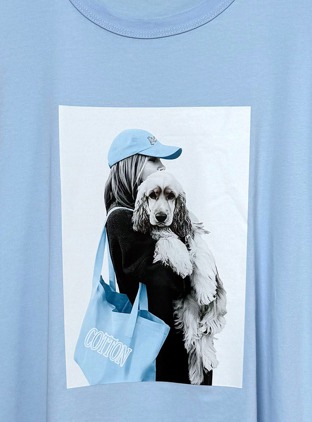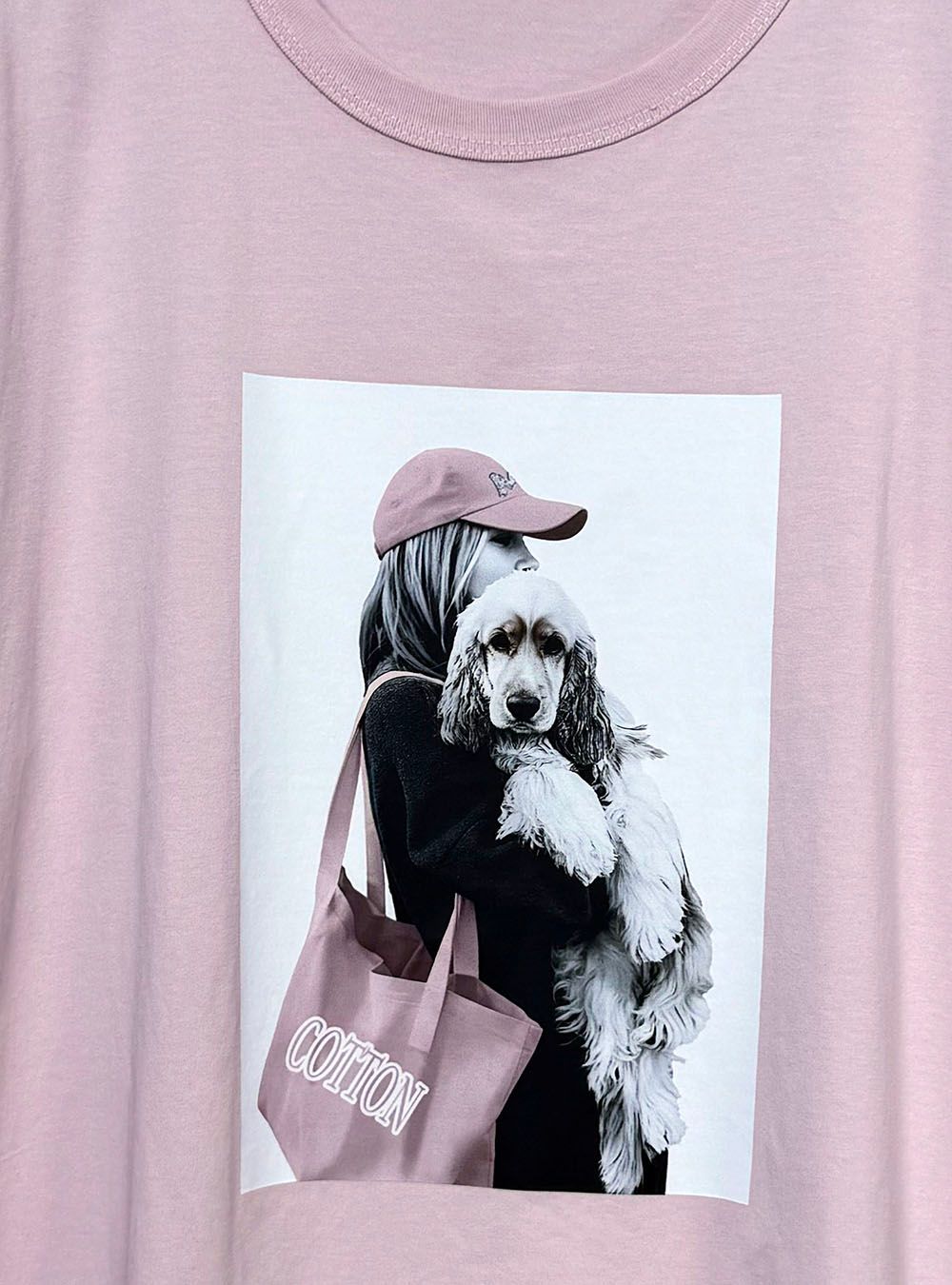 Camiseta de manga corta, disponible en varios colores. Cuello redondo y de corte relajado. Presenta un diseño gráfico central que muestra a una mujer con gorra y bolsa sosteniendo un perro Cocker.