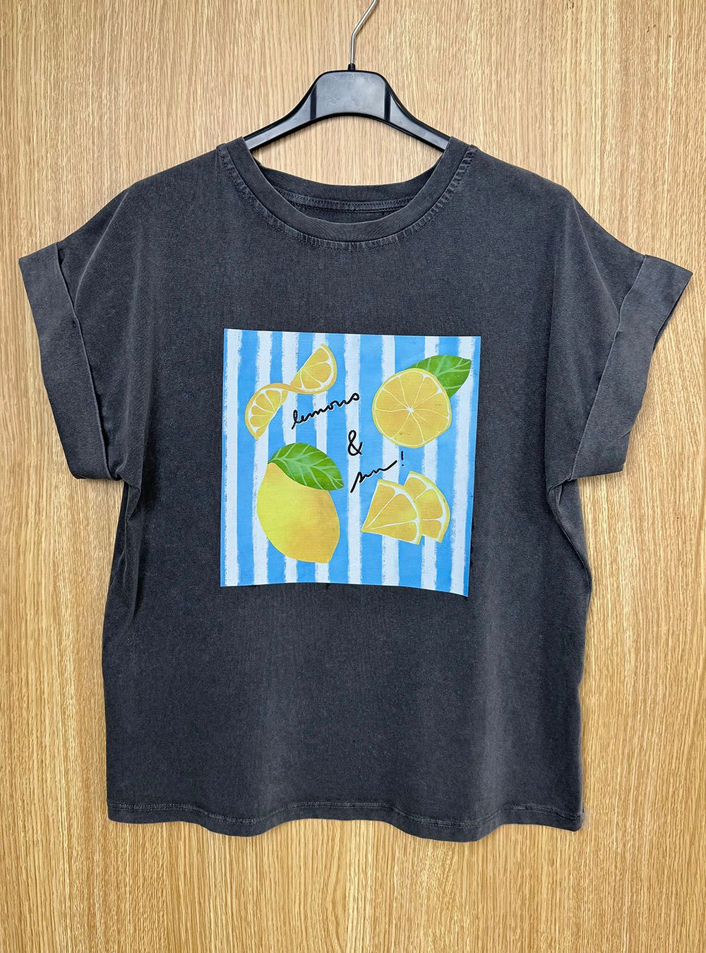 Camiseta básica de manga corta ancha con vuelta y cuello redondo. Confeccionada en algodón delavado y de corte relajado. Print delante con diseño Lemons & Beach.