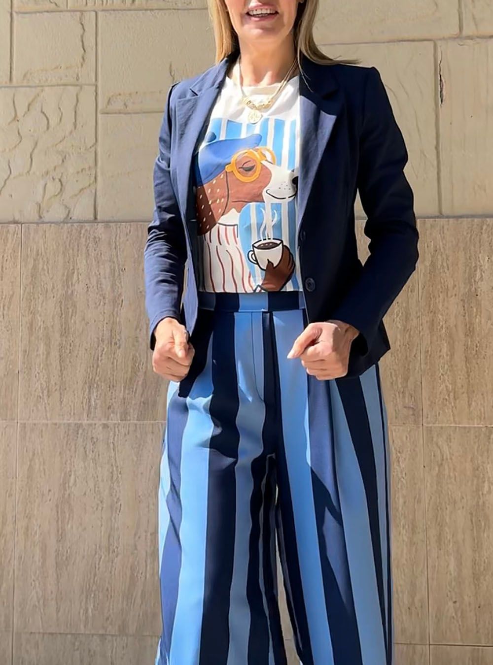 Camiseta básica de manga corta ancha con vuelta y cuello redondo. Fondo azul con rayas verticales. Confeccionada en algodón delavado y de corte relajado. Print delante con diseño perrito Teckel con gafas tomando café.