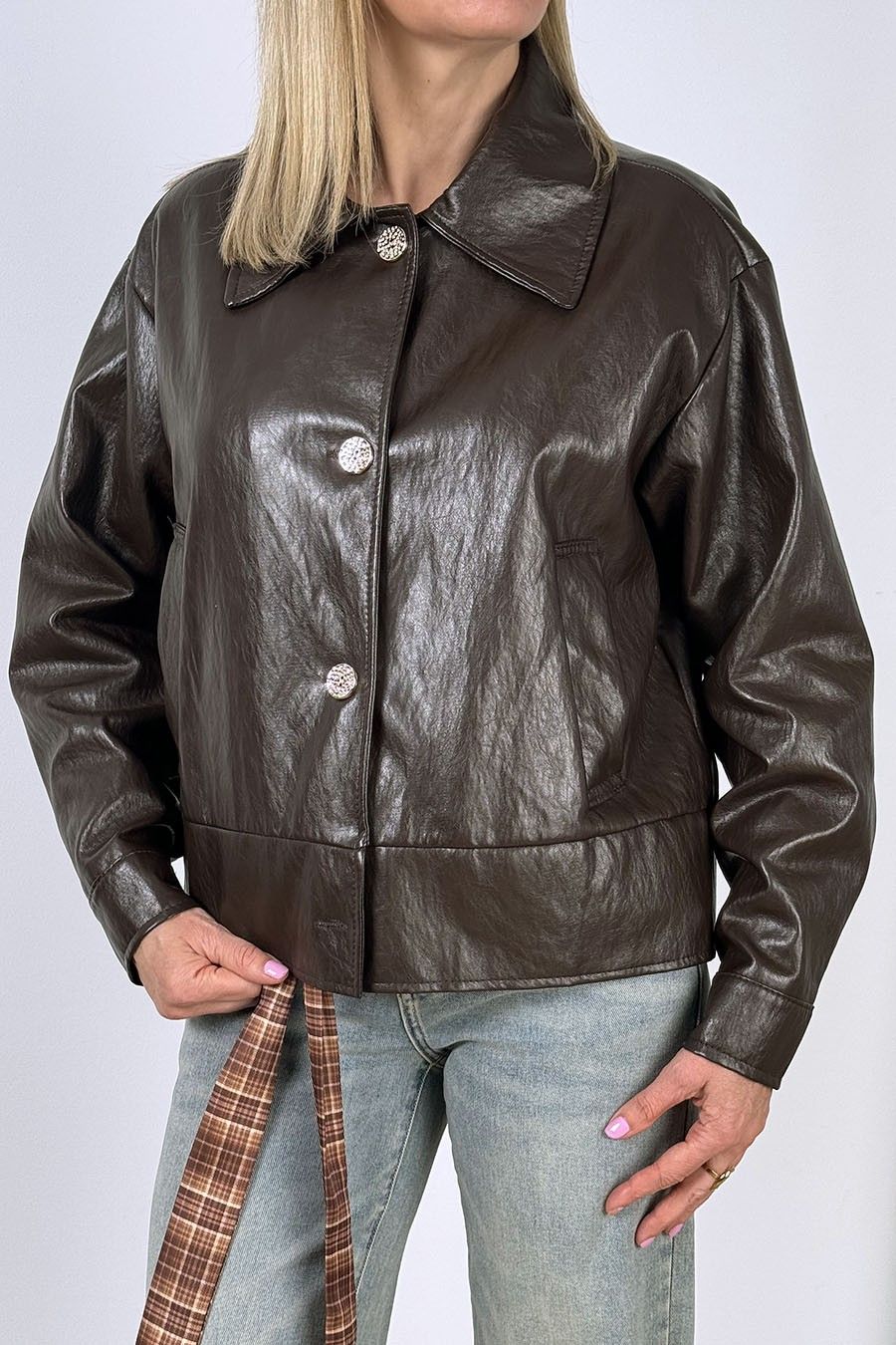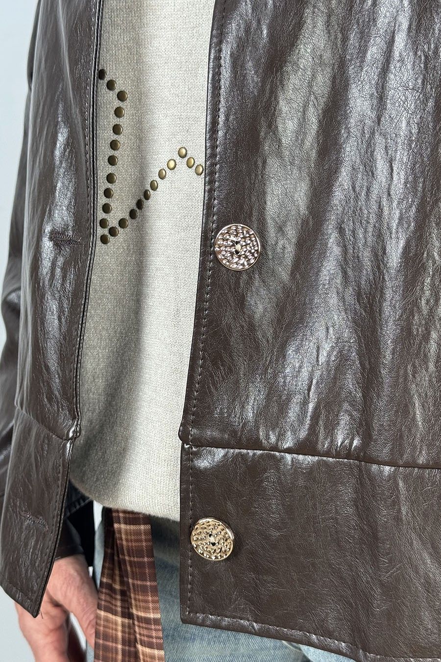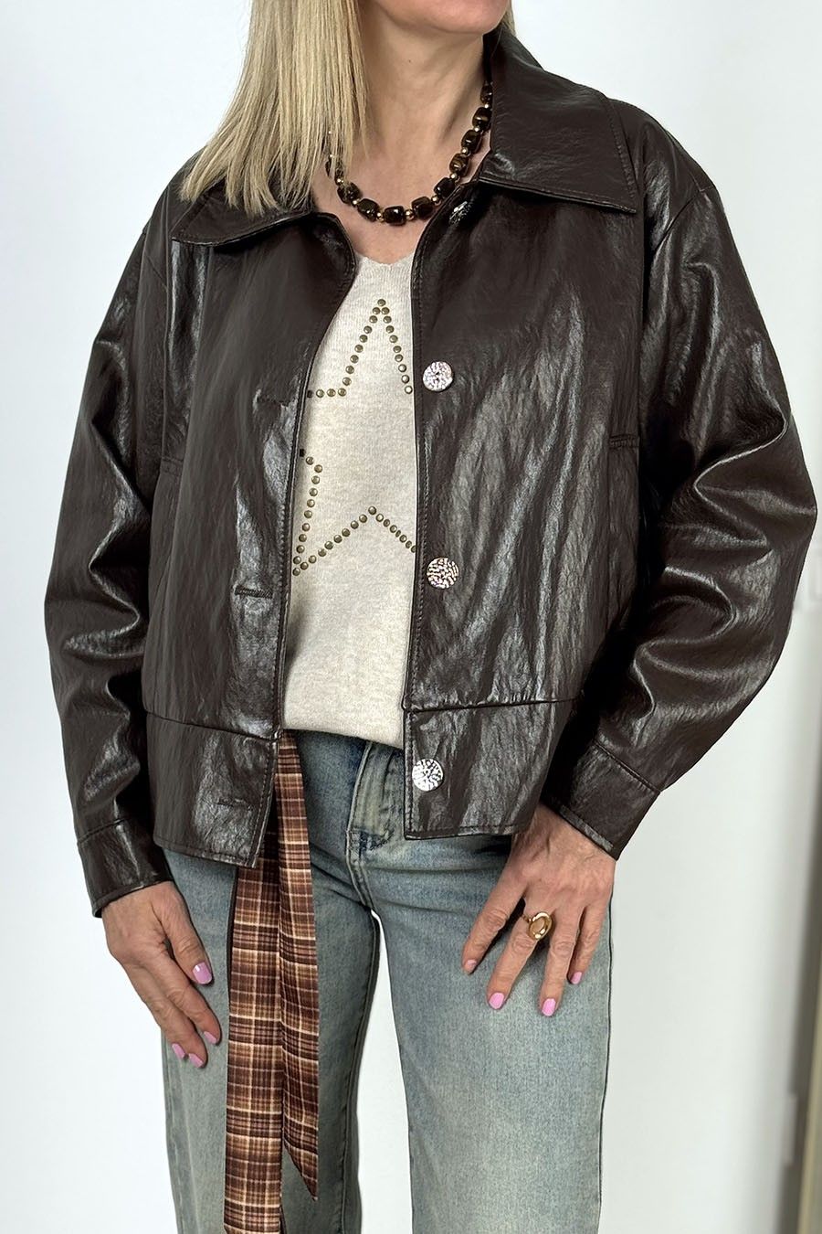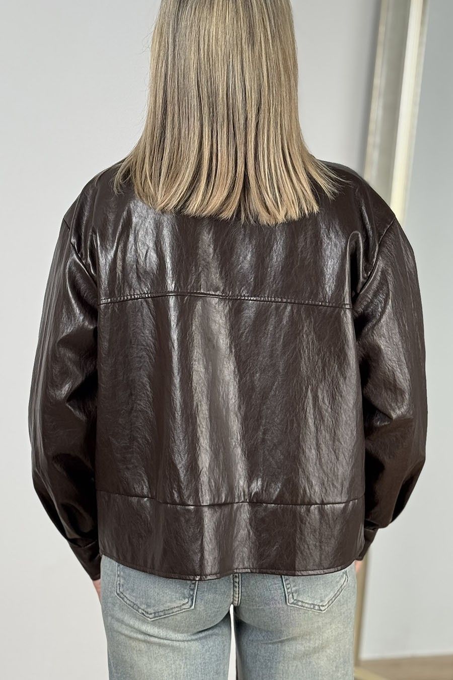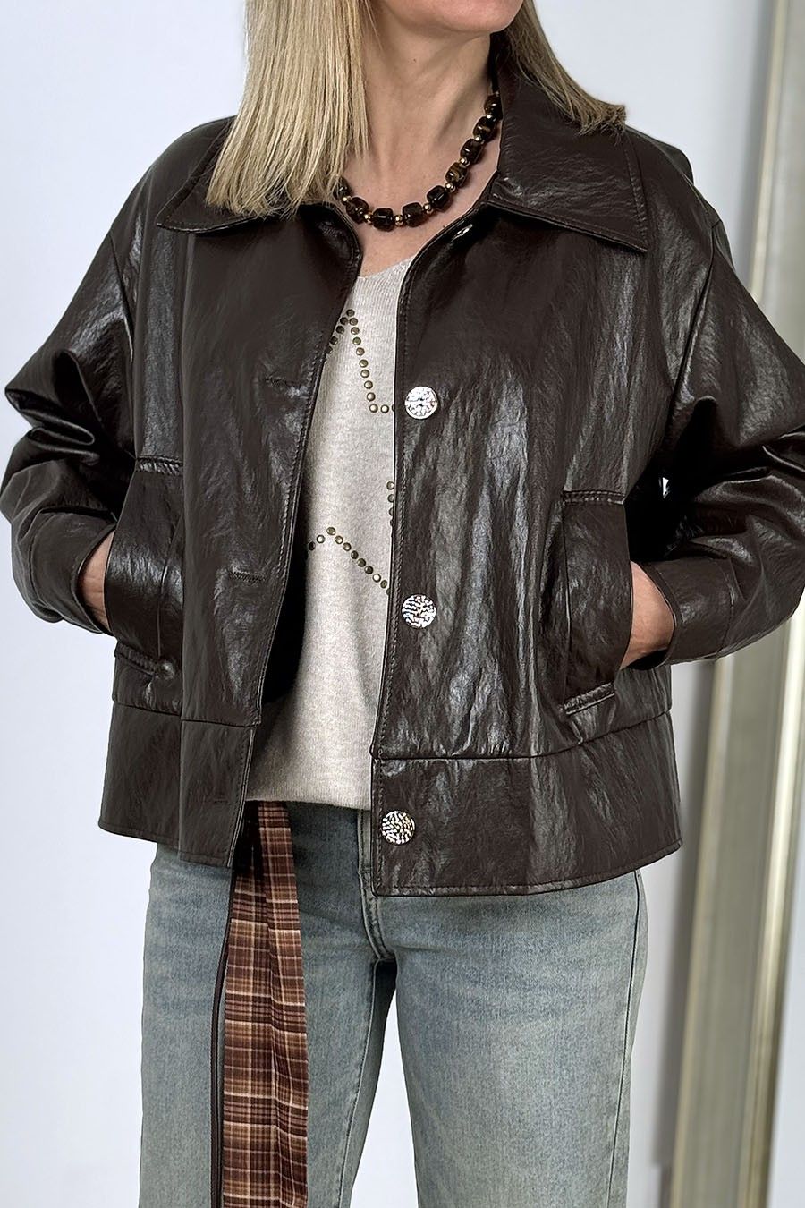 Cazadora corta efecto piel. Cuello solapa y manga larga. Cierre frontal con botones metálicos dorados texturados a contraste. Bolsillos delanteros y acabado con doble costura horizontal detrás. Tacto extra suave.
