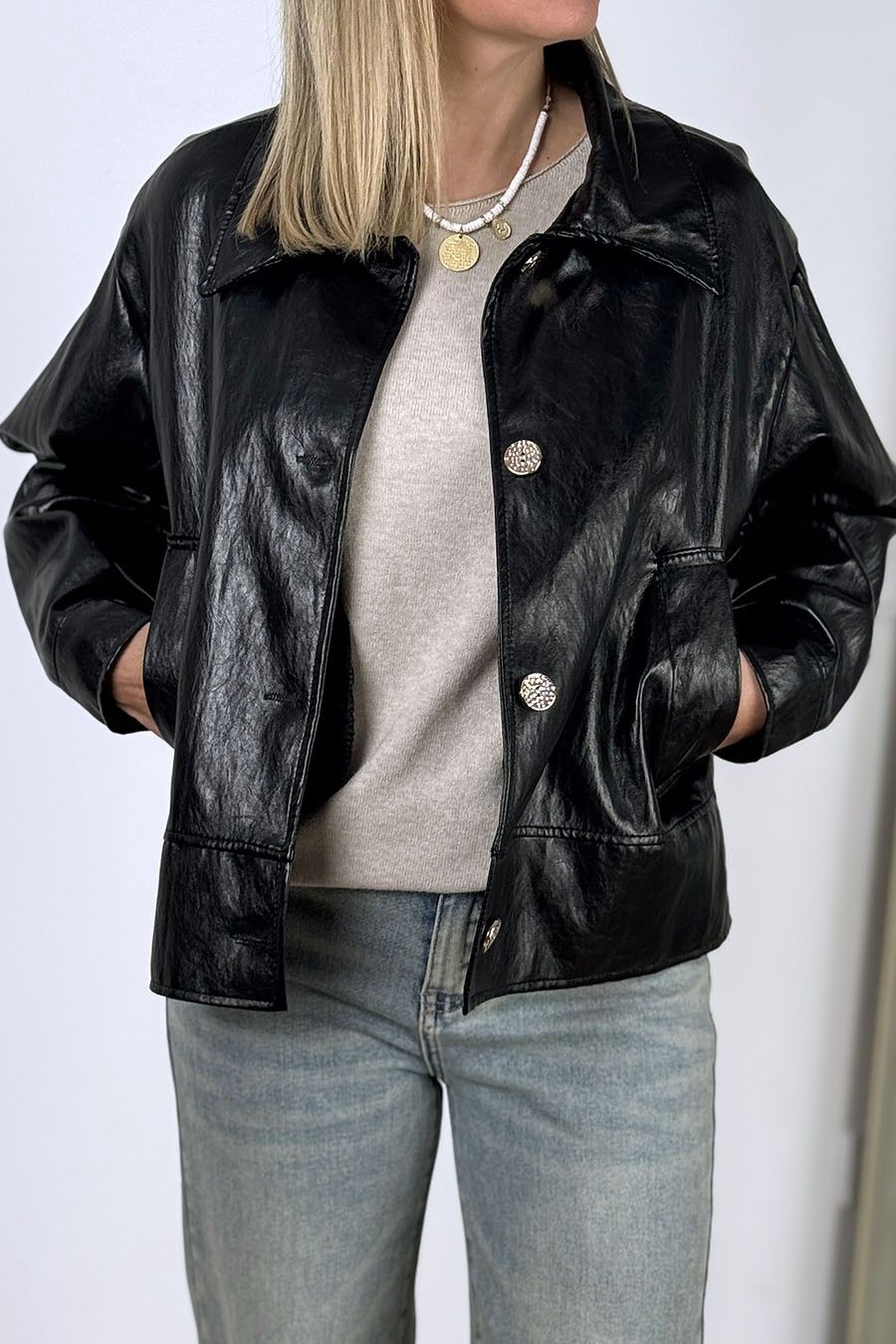 Cazadora corta efecto piel. Cuello solapa y manga larga. Cierre frontal con botones metálicos dorados texturados a contraste. Bolsillos delanteros y acabado con doble costura horizontal detrás. Tacto extra suave.