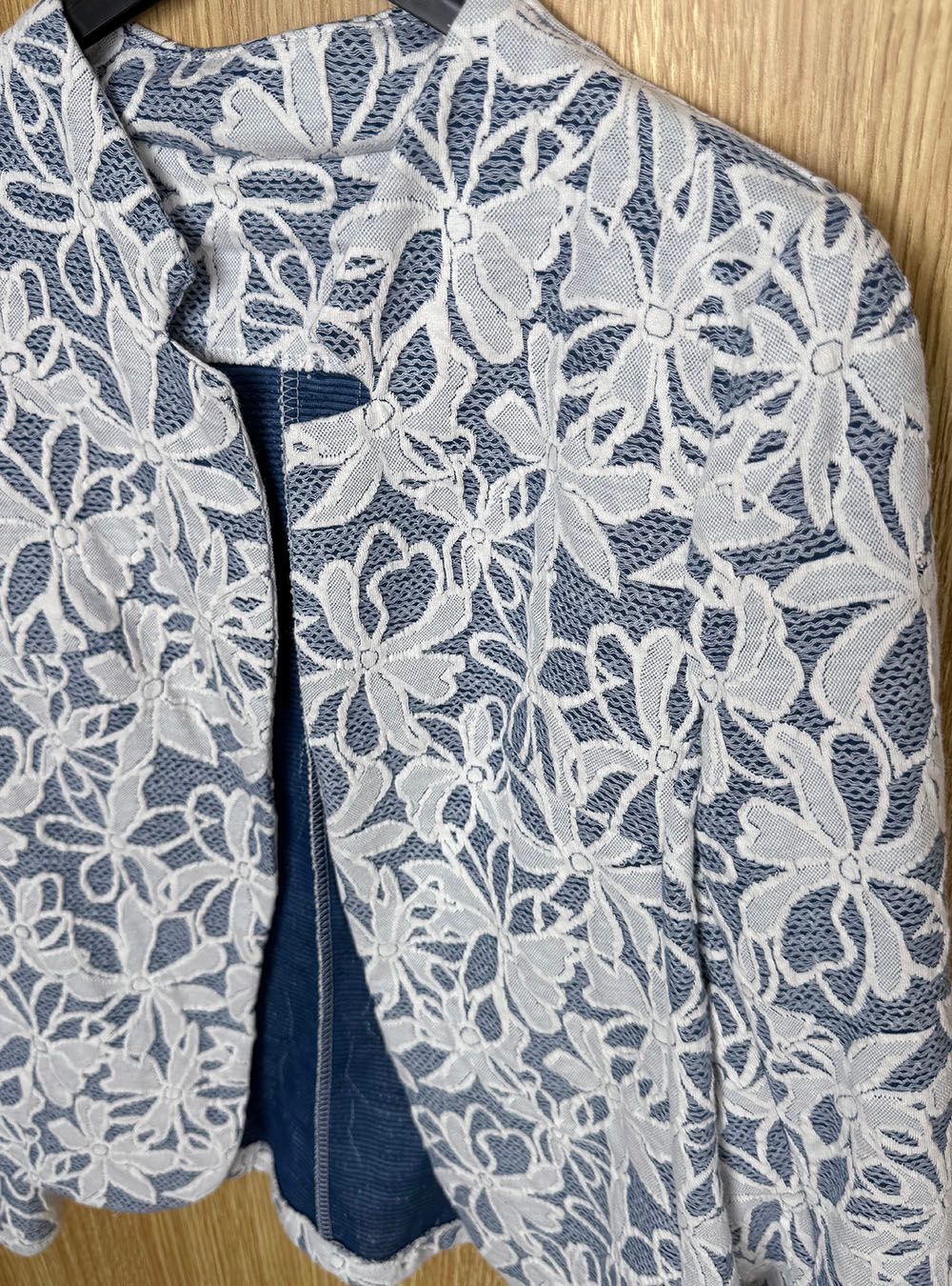 Chaqueta abierta elástica, sin botones, confeccionada en blonda con relieve y diseño floral. Corte entallado y cuello mao. Ideal para tus looks casual relajados y también para outfits más formales de tu día a día.