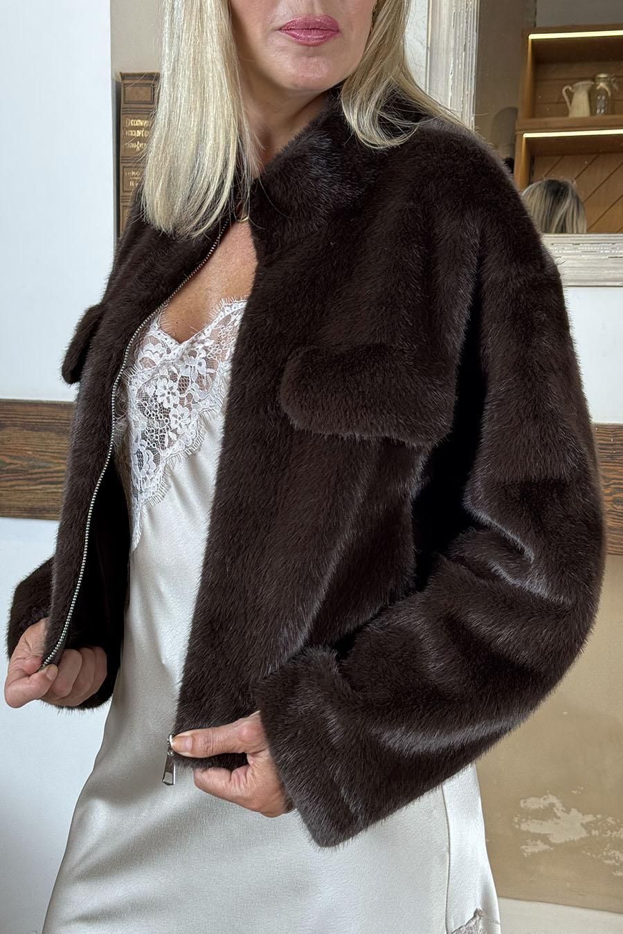 Chaqueta corta efecto pelo marrón