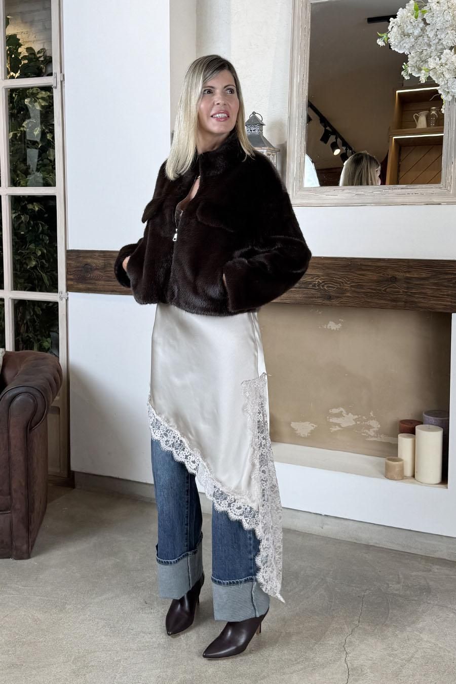 Chaqueta corta confeccionada con tejido efecto pelo muy suave. Cuello perkins, cierre delante con cremallera. Detalle de dos solapas delante que simulan dos bolsillos. Dos bolsillos laterales y forro de raso satinado interior.