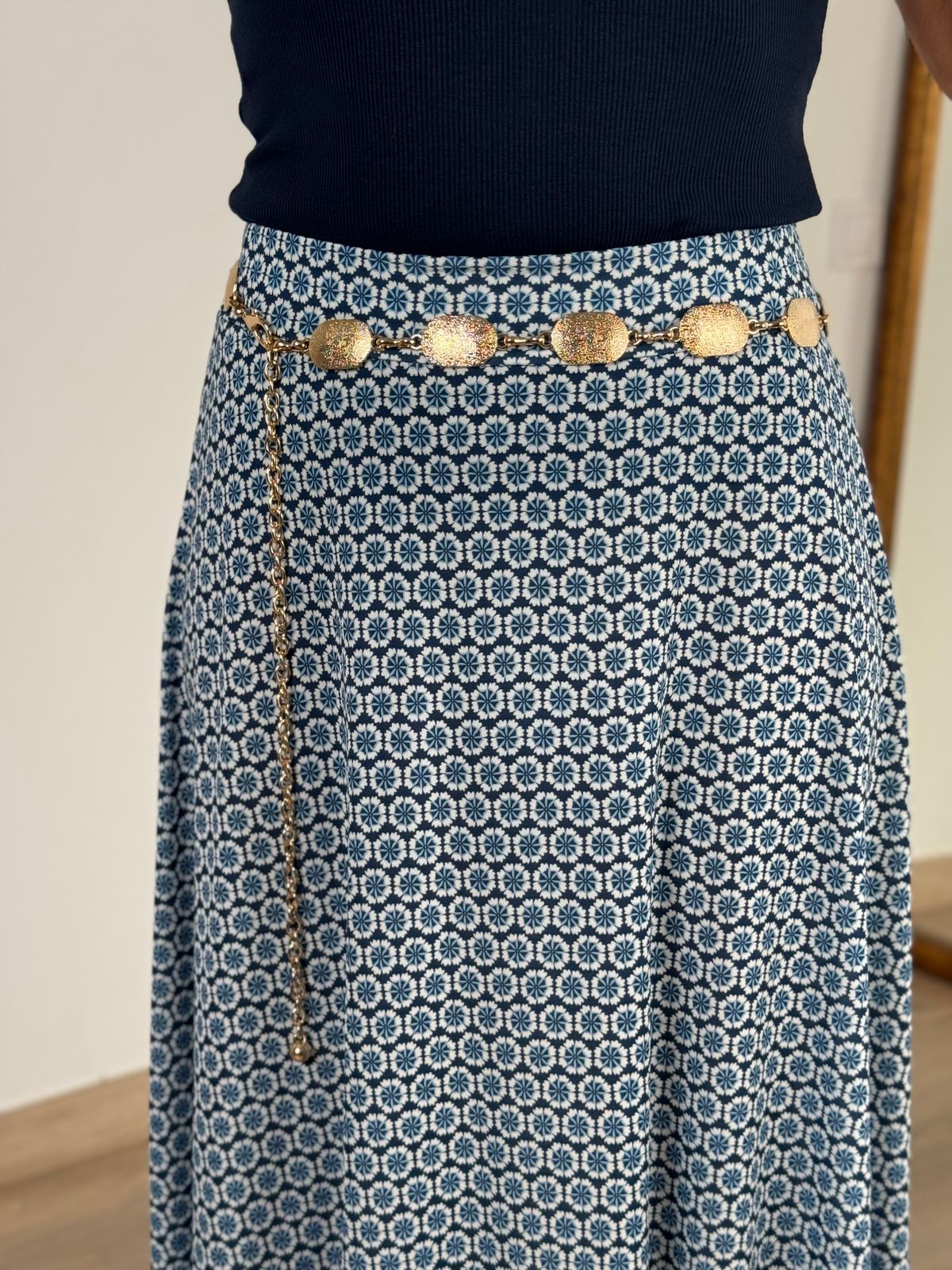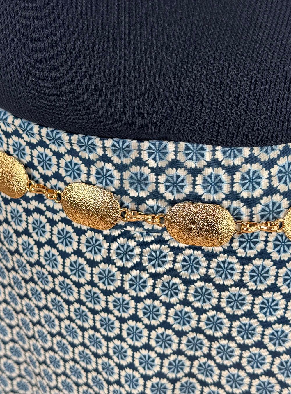 Cinturón de cadena metálico y acabado en dorado de inspiración bohemia. Se compone de cadena ajustable mediante cierre con mosquetón y piezas ovaladas con acabado texturado repartidas de manera equidistante por todo el perímetro.