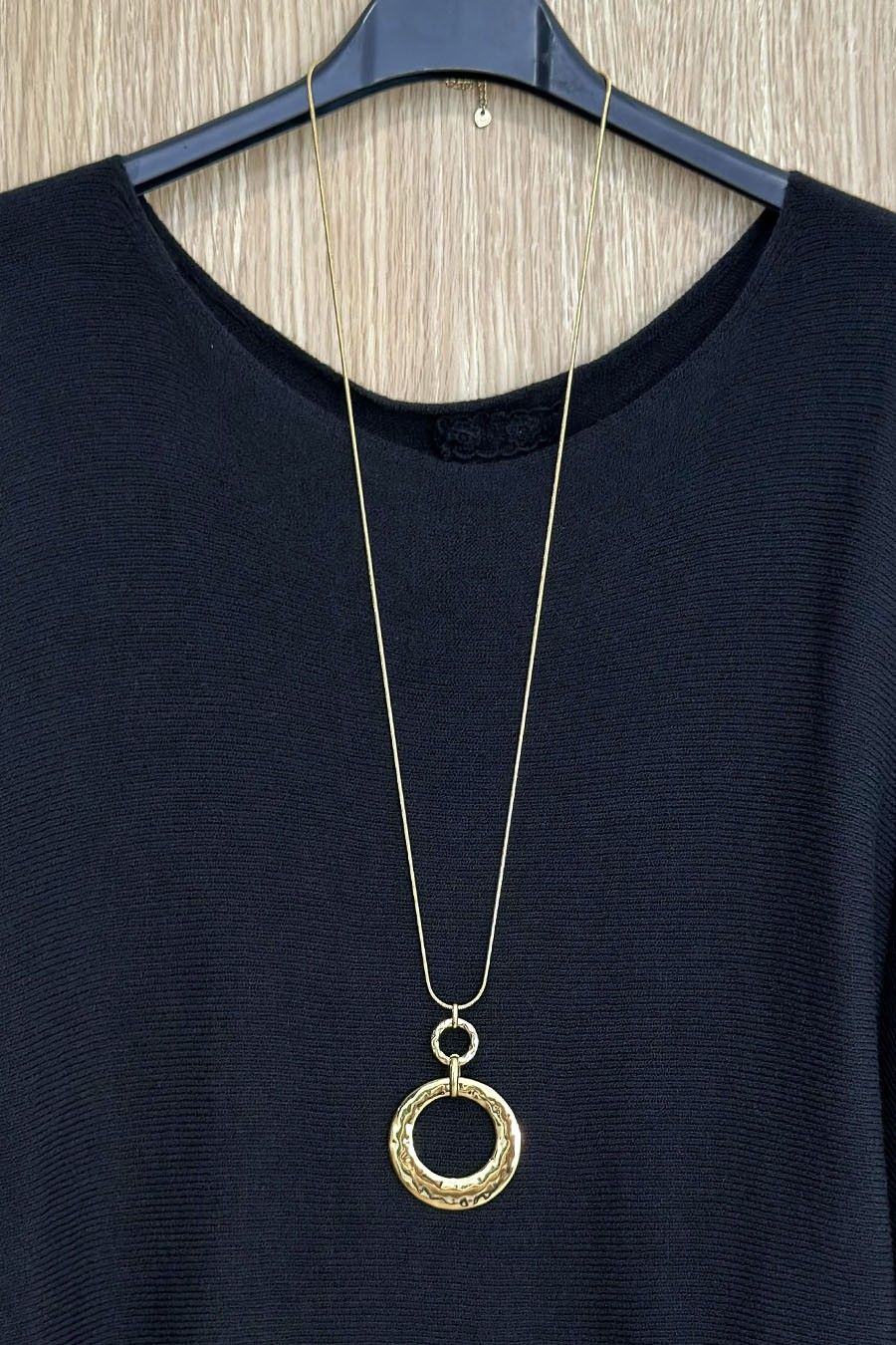 Collar largo de acero dorado compuesto por cadena de grosor medio y dos aros de diferentes diámetros unidos por dos soportes ovalados.