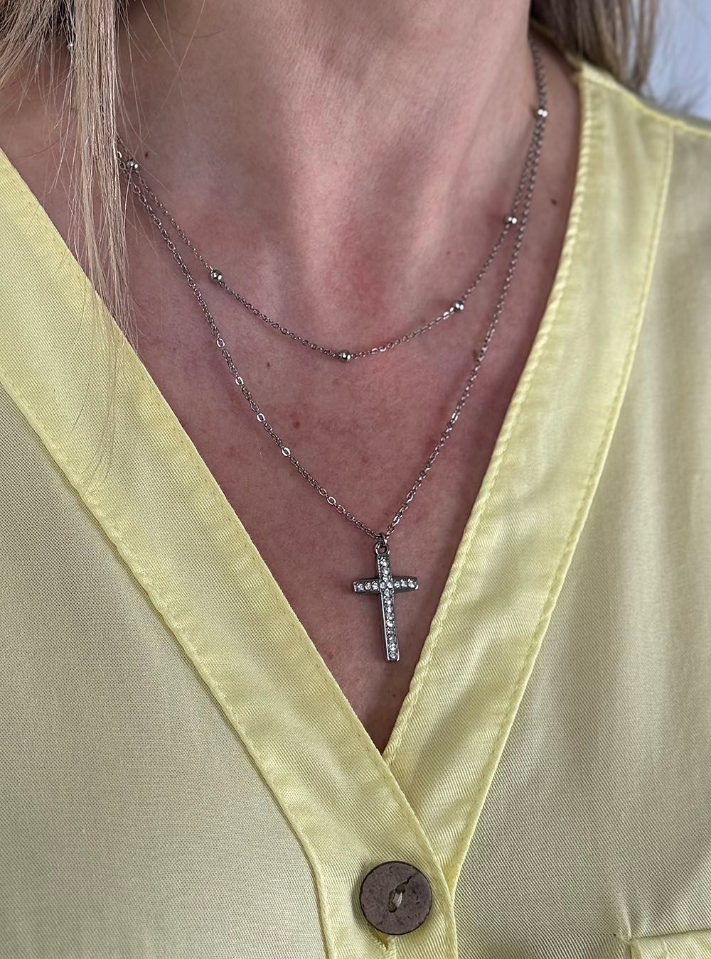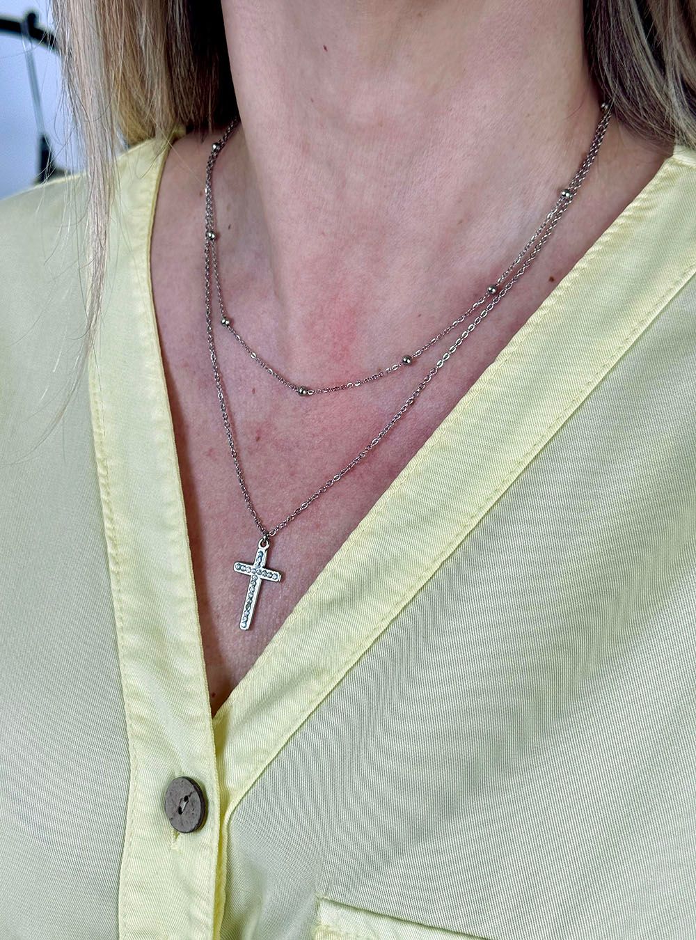 Gargantilla doble con un delicado diseño minimalista. La primera cadena incluye pequeñas bolas intercaladas. La segunda presenta un colgante de cruz clásica acabado con sutiles incrustaciones brillantes que aportan un brillo especial. Un accesorio versátil ideal para looks clásicos y casual.