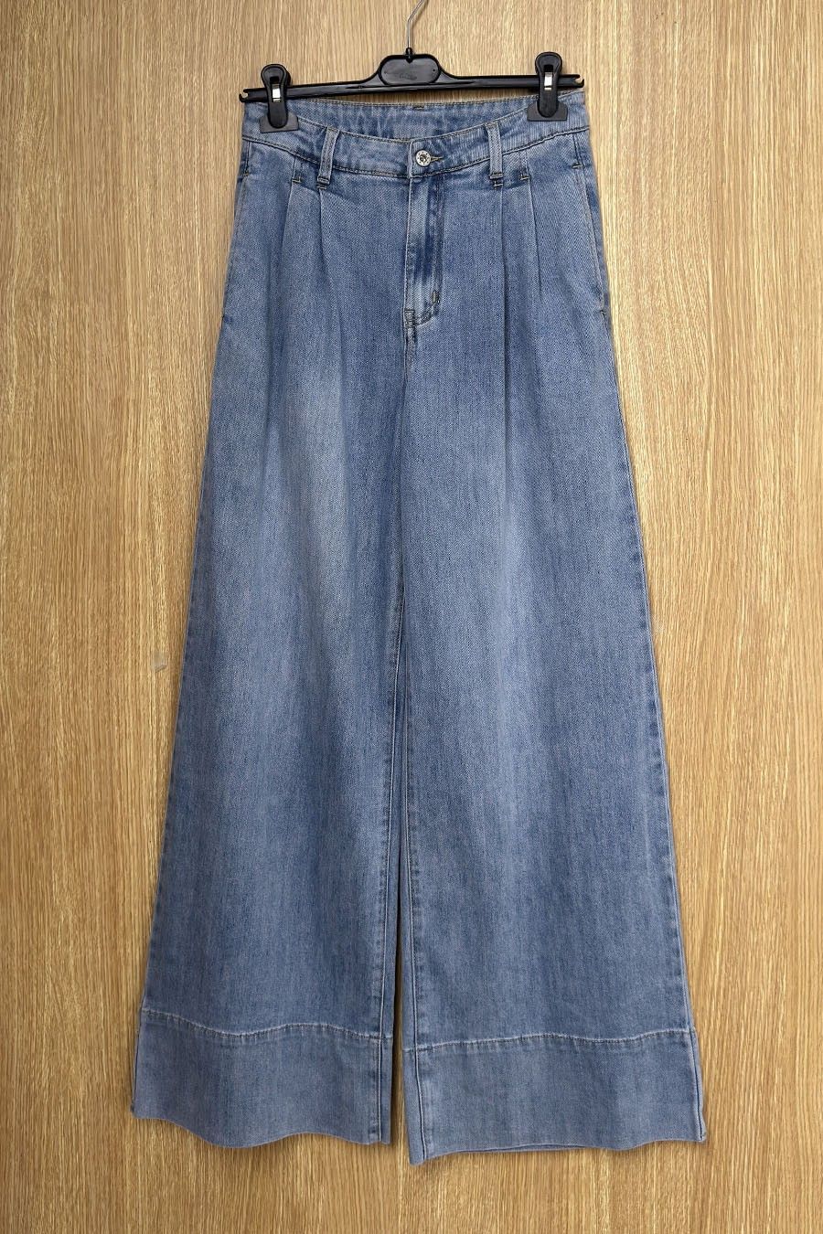 Vaqueros wide leg de tiro alto con trabillas en la cintura, confeccionados en tejido tejano elástico. Detalle de bolsillos laterales y cuatro pinzas delante. Cierre con cremallera y botón metálico. Corte ancho fluído.