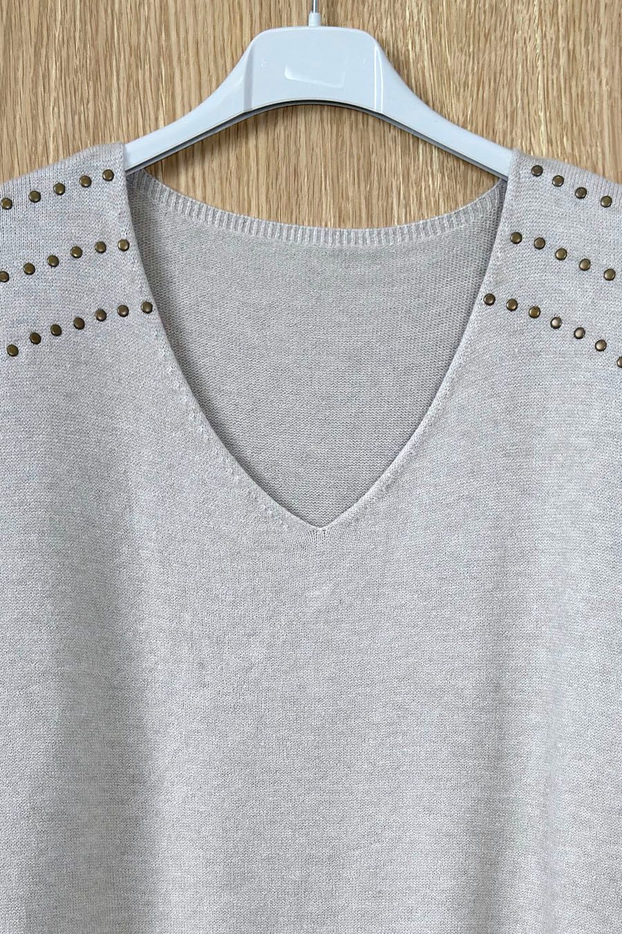Jersey de manga larga confeccionado en punto fino. Cuello en V y diseño fluído. Detalle de tres tiras de tachuelas dorasas en ambos hombros. Cintura y puños acanalados.