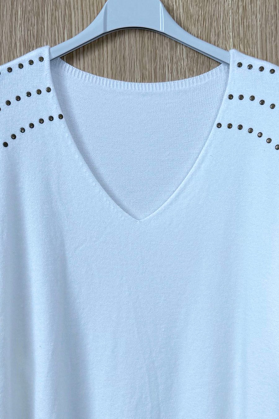 Jersey de manga larga confeccionado en punto fino. Cuello en V y diseño fluído. Detalle de tres tiras de tachuelas dorasas en ambos hombros. Cintura y puños acanalados.