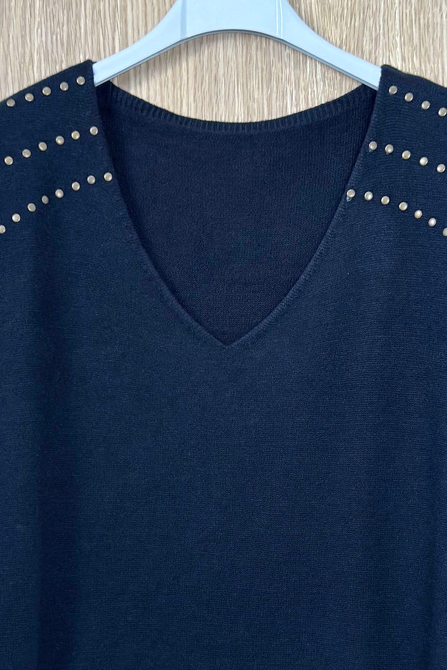 Jersey de manga larga confeccionado en punto fino. Cuello en V y diseño fluído. Detalle de tres tiras de tachuelas dorasas en ambos hombros. Cintura y puños acanalados.