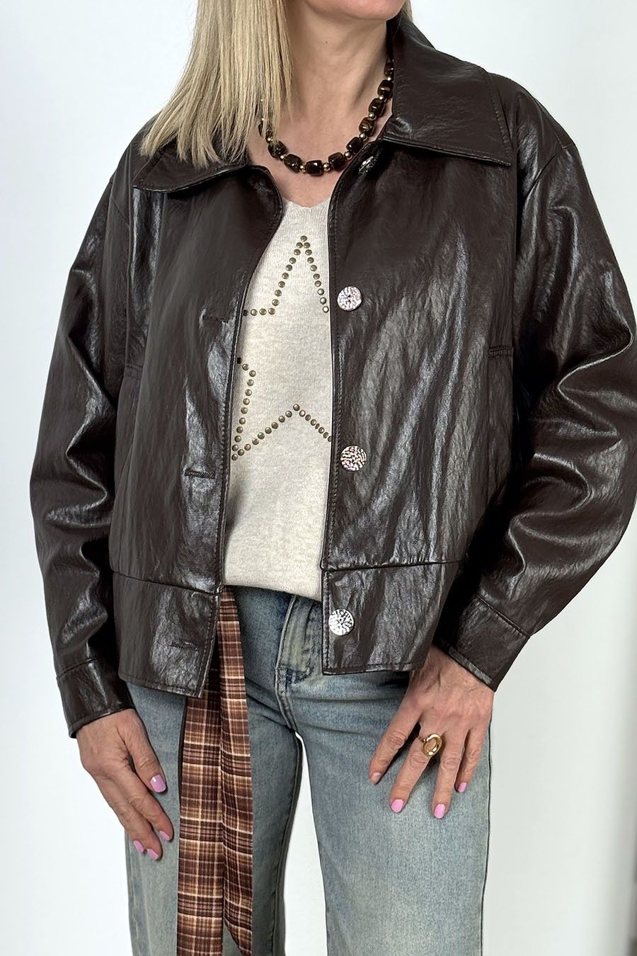 Jersey de manga larga liso, confeccionado en punto fino. Cuello de pico y diseño fluído. Acabado canalé en puños y cintura. Detalle de estrella compuesta por tachitas doraditas en su perímetro.TALLA ÚNICA: compatible con XS, S y MALTURA MODELO: 1,69 - lleva habitualmente la talla SCOMPOSICIÓN: 52% viscosa, 26% PBT, 22% nylon