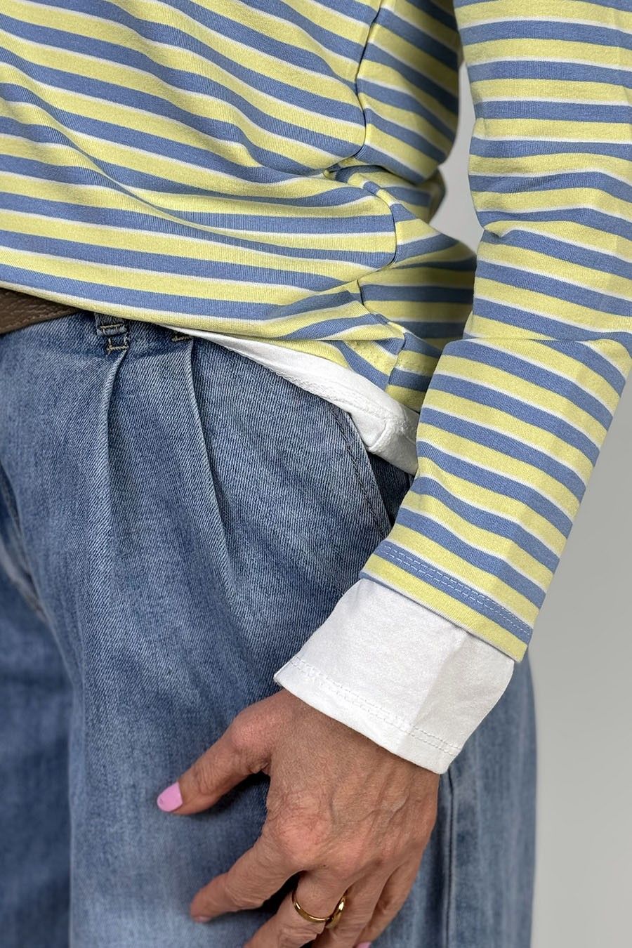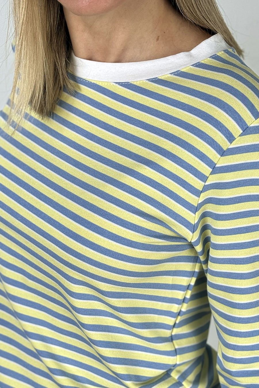 Jersey de manga larga estampado a rayas finas horizontales, Confeccionado en punto de grosor medio incluye detalle, en puños y cintura, de "efecto camiseta interior". Cuello redondo a contraste y diseño fluído.