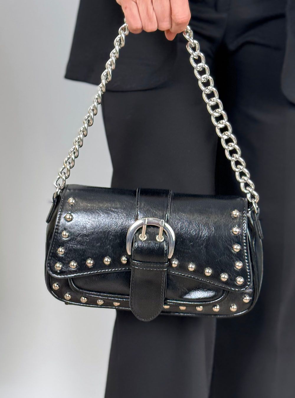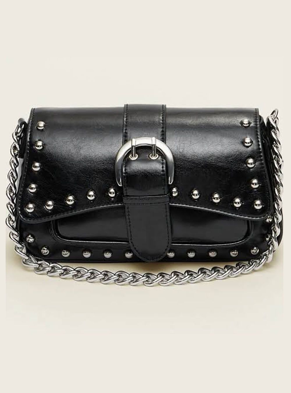 Bolso de hombro de estilo "mini bag". Detalle de tachuelas metálicas y una hebilla grande plateada en la solapa frontal. Confeccionada en cuero sintético (PU) con acabado liso. Incluye solapa con cierre magnético y una correa de cadena metálica corta para llevar al hombro. Ideal para looks modernos y mezcla de estilos.