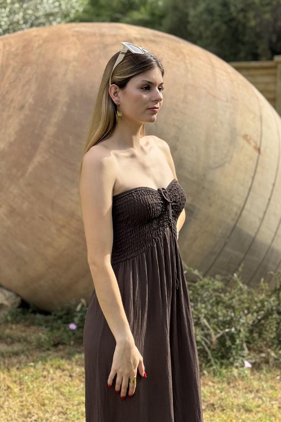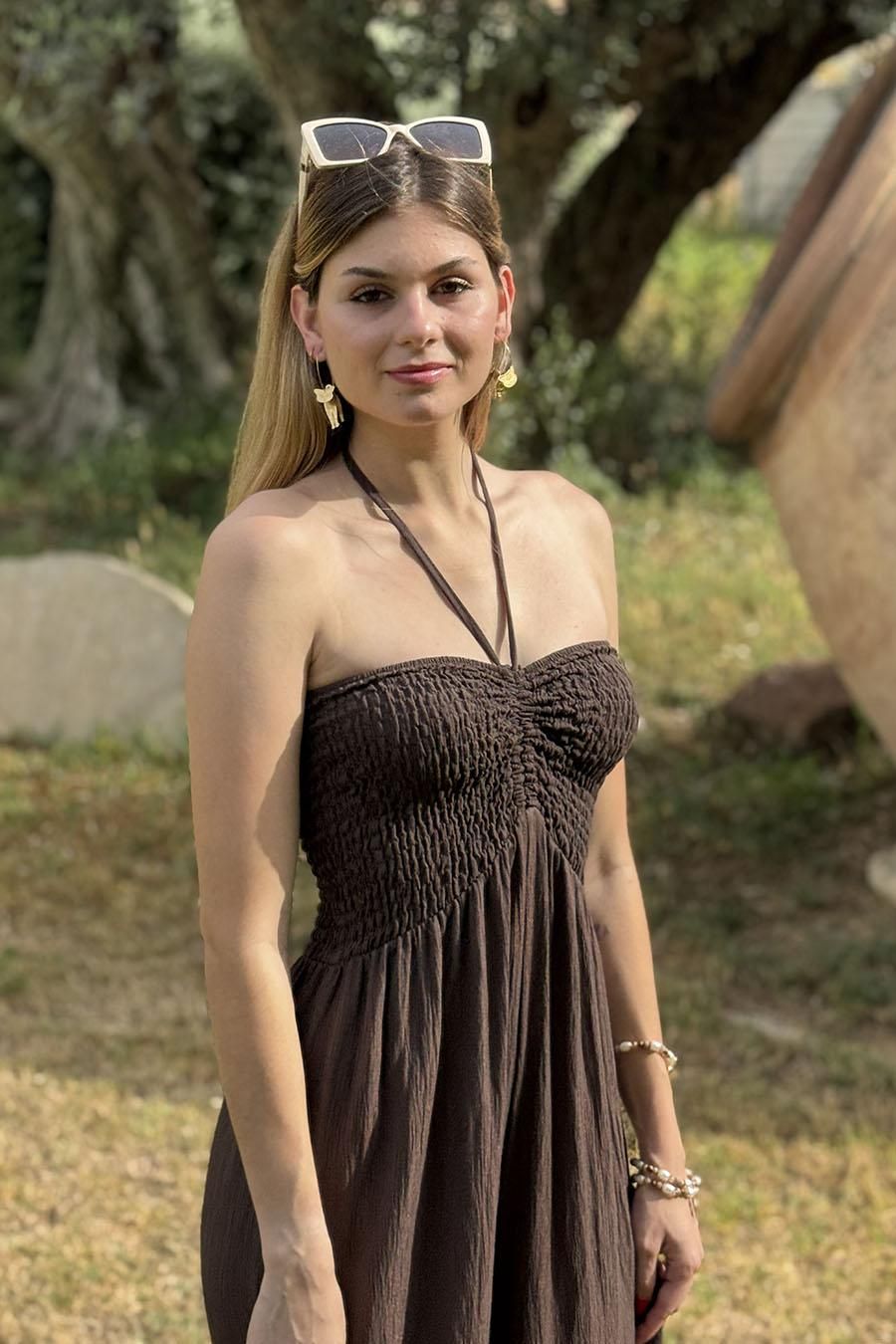 Mono oversize largo fluído confeccionado en tejido bámbula. Escote palabra de honor y pecho elástico nido de abeja elástico con dos tiras que pueden atarse como un lazo o atadas al cuello.