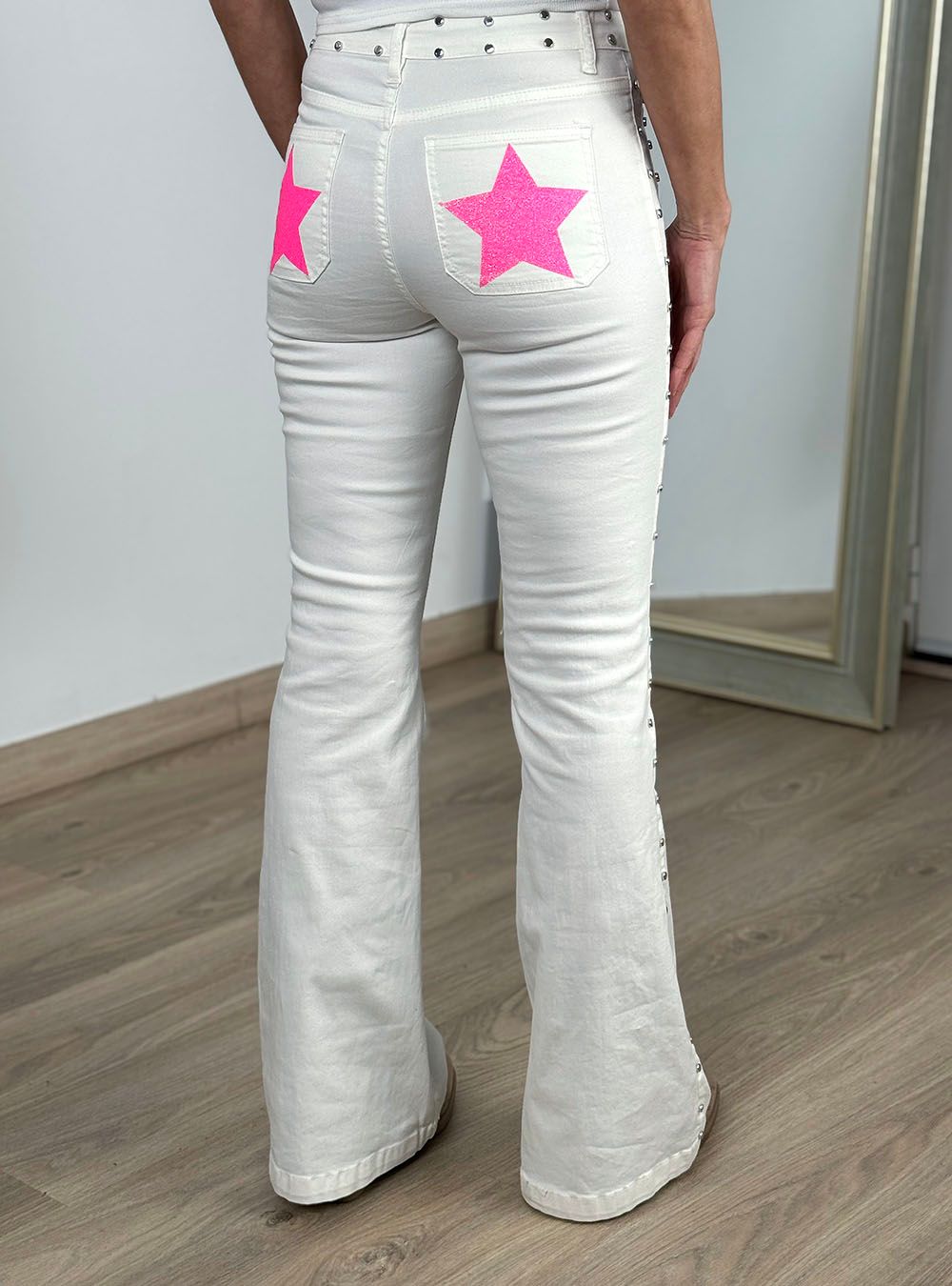 Pantalón campana estilo jeans con dos estrellas fucsia con acabado brillante en los bolsillos traseros. Detalle de tachuelas metálixas en cintura, bolsillos y laterales pernera. Es de tiro medio y está confeccionado en algodón elástico. Dispone de cuatro bolsillos, dos delante estilo pocket y dos detrás. Cierre con botón y cremallera. Un pantalón cómodo, versátil y estiloso perfecto para tus looks de diario o de fin de semana.