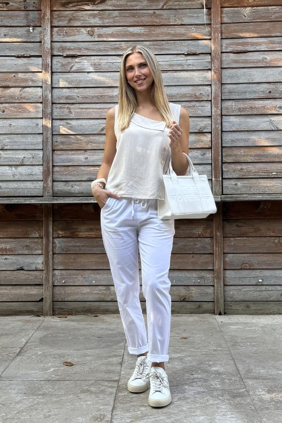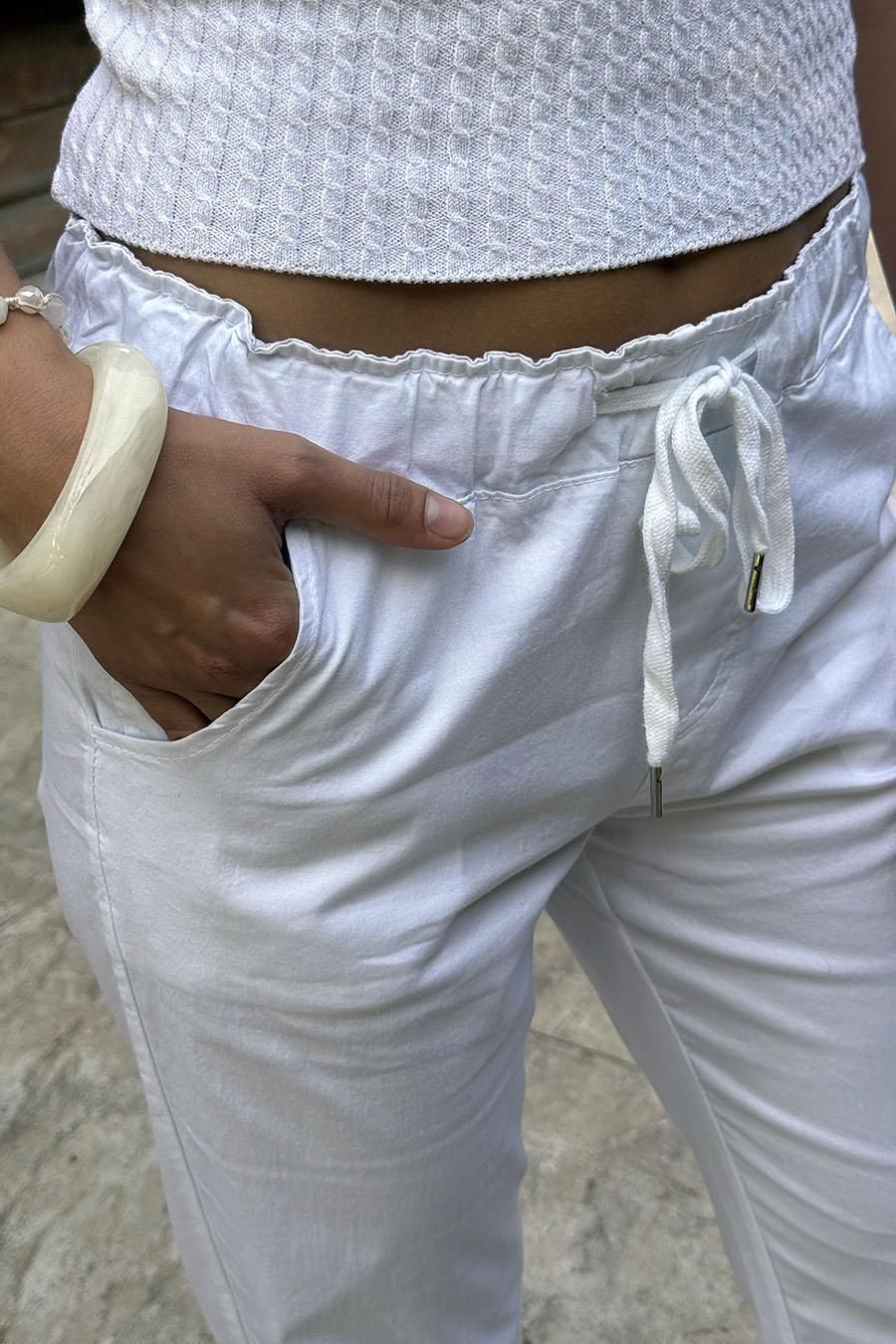 Pantalón jogger de tiro medio. Cintura elástica y cordón para un mejor y más cómodo ajuste. Dos bolsillos laterales.