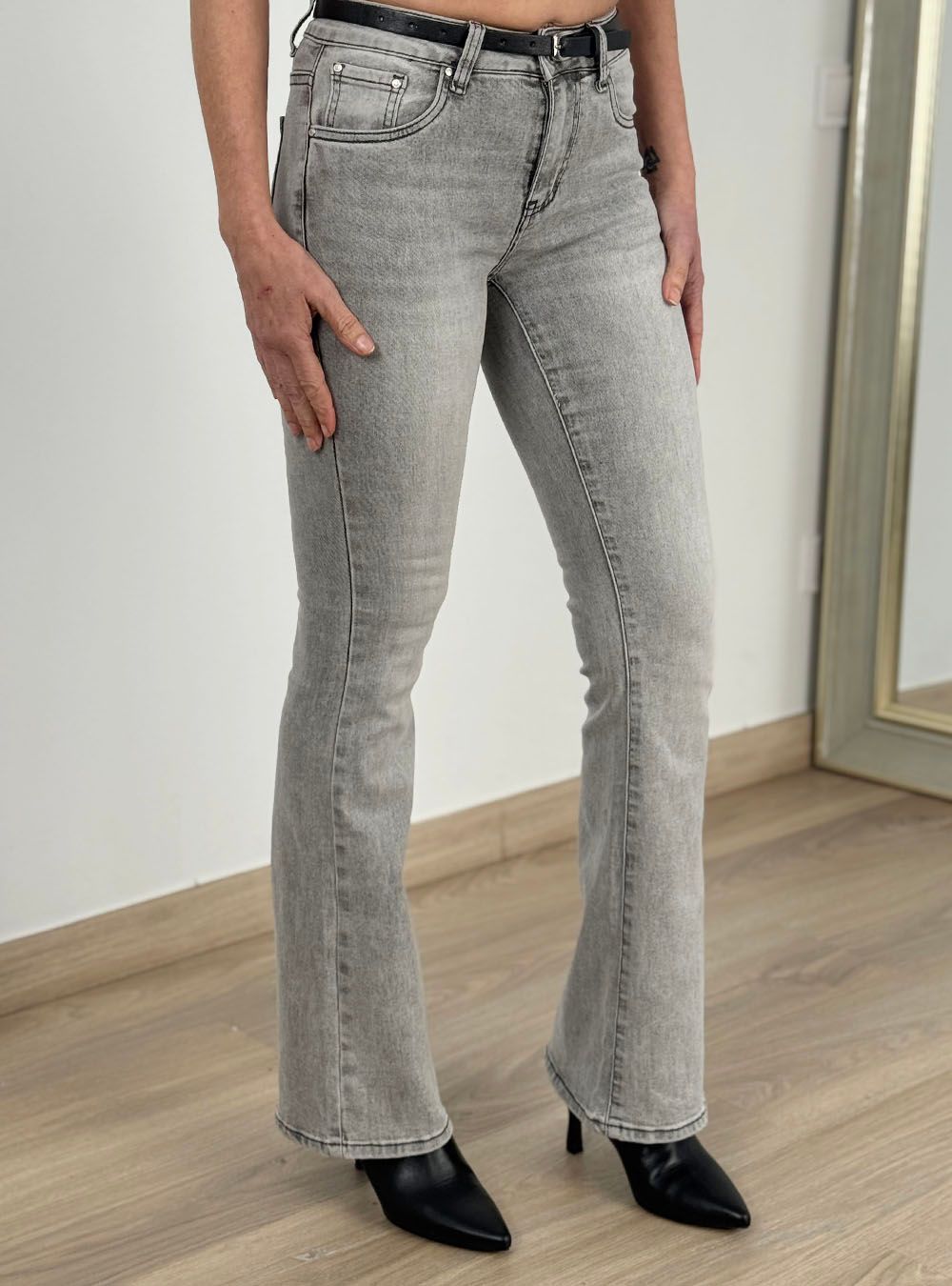Jeans elásticos campana de tiro medio. Confeccionados en tejido denim súper elástico. Cinco bolsillos y cierre con botón y cremallera. Incluye un cinturón fino de piel sintética y hebilla metálica.