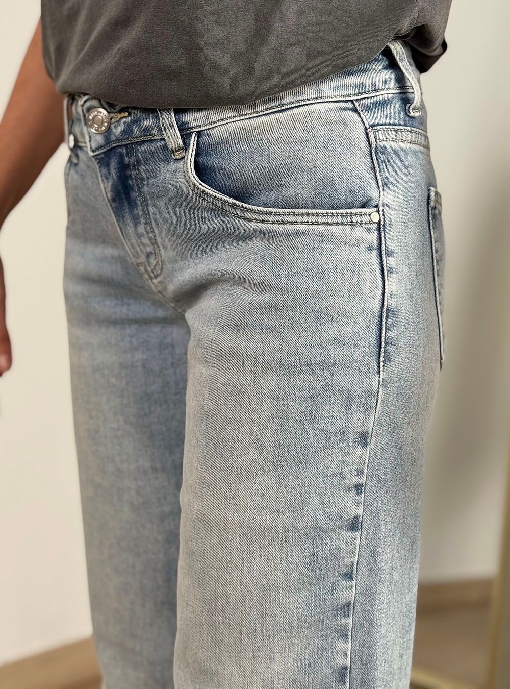 Vaqueros wide leg de tiro bajo con trabillas en la cintura, confeccionados en tejido tejano elástico y corte recto relajado. Detalle en bolsillos traseros de diseño de estrellas de color azul marino ribeteadas con brillantes pequeños. Cierre con cremallera y botón metálico. *Recomendamos una talla más de la que llevas habitualmente.